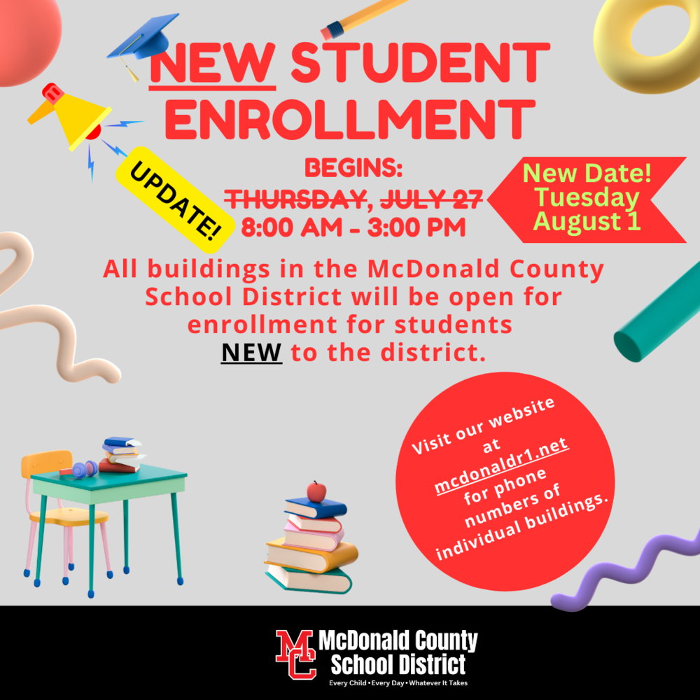 If you have a student new to the McDonald County School District, all buildings will be open starting Tuesday, August 1, at 8 a.m. for New Student enrollment.